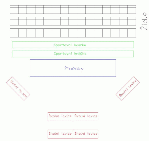 Nákres ideálního uspořádání prostoru při vystoupeních v tělocvičnách
